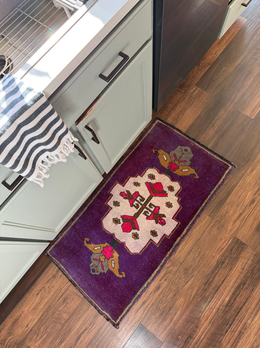 I love this little rug so much! It is perfect for my closet space that actually only shows half the rug anyway. It’s easy to keep clean, I love that it’s vintage and unique, and the colors are so lovely. I didnt even see the dark purple accent til I got home, which works with other colors in my closet. It was fun looking at it with owner, Julie. She saw it as a chandelier and I thought it was a lady with long legs - haha!