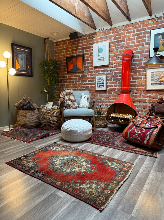 Velvet & Shag offers a delightful assortment of Turkish, Persian, Moroccan, & Afghan rugs for your choosing in a variety of sizes from minis to runners to area rugs. Most of them are vintage being at least twenty years old. However, we do supply a limited number of modern rugs, as well. If you are having a hard time pinning down the size or style that you're looking for, start by scrolling our entire selection below. If you still can't decide or don't see what you want, then please message us to assist you with your hunt in finding you the perfect floor art for your space.