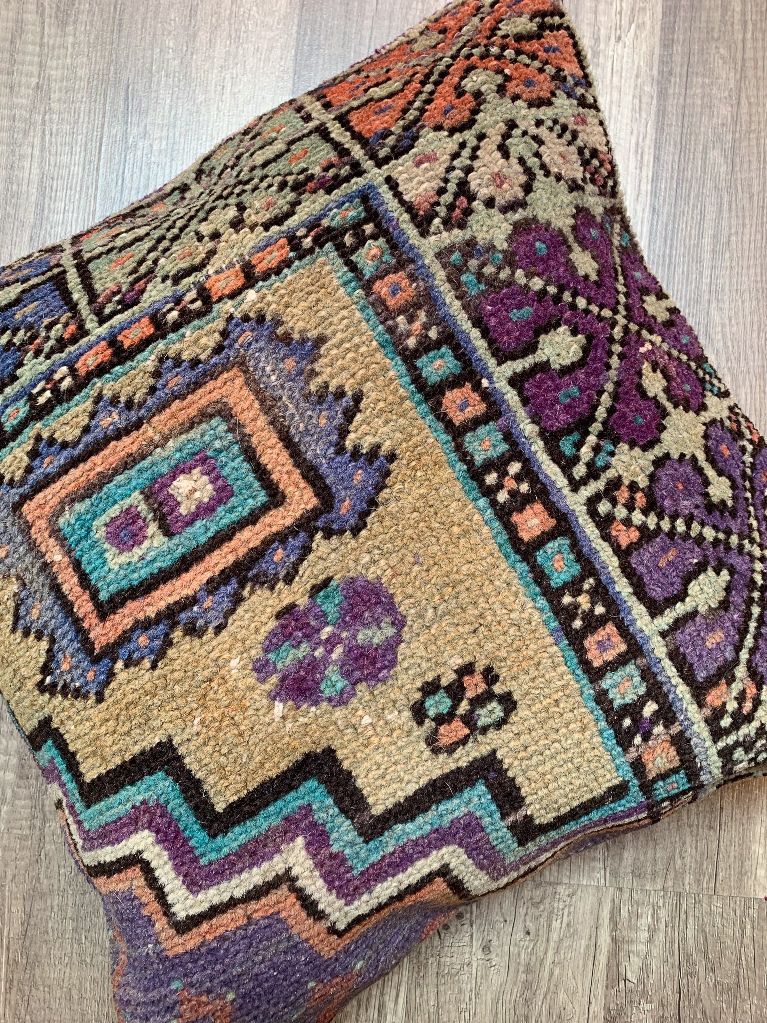 One-of-a-kind pillow cover handmade with vintage Turkish rugs. Due to natural wear and tear of any vintage rug/textile, color may be faded or spotted and the wool may be worn, which adds to the charm of this one-of-a kind piece.