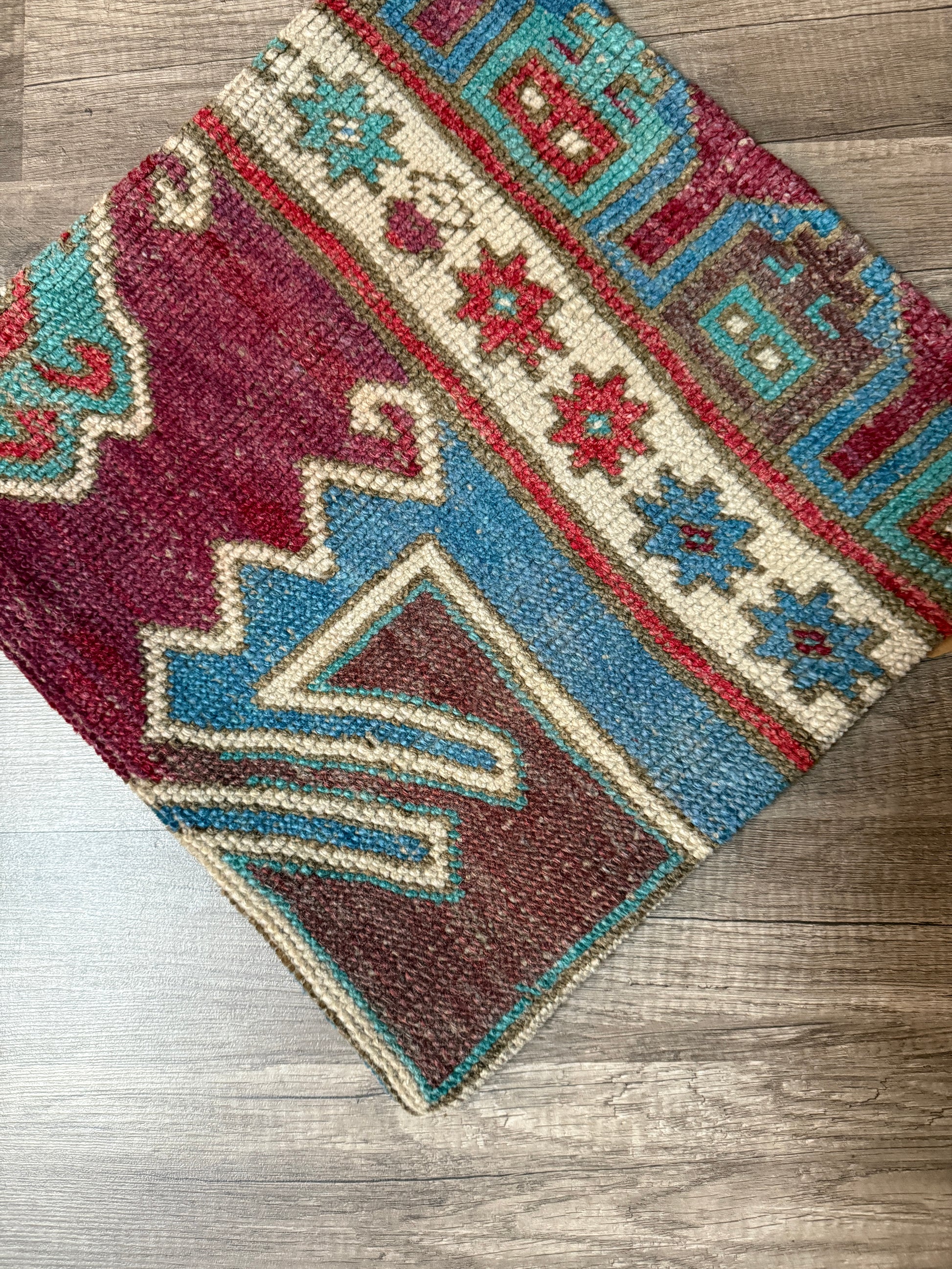 One-of-a-kind pillow cover handmade with vintage Turkish rugs. Due to natural wear and tear of any vintage rug/textile, color may be faded or spotted and the wool may be worn, which adds to the charm of this one-of-a kind piece.