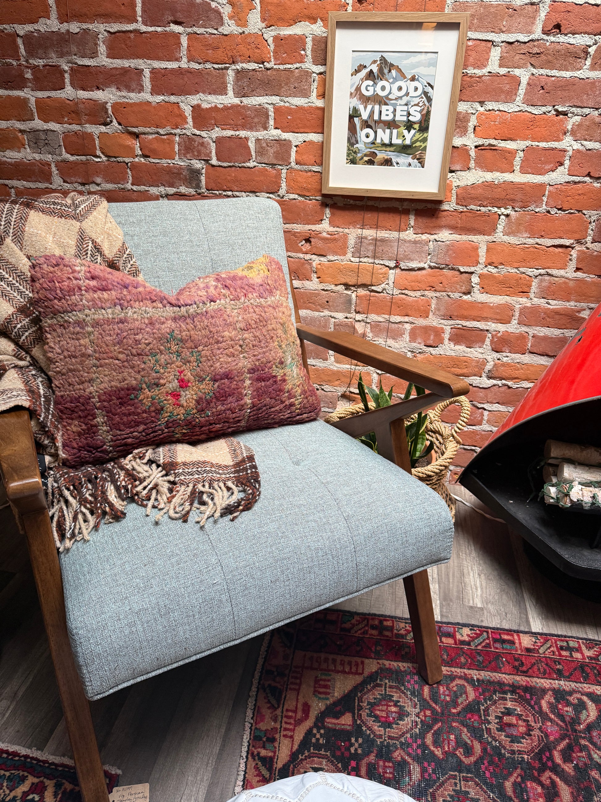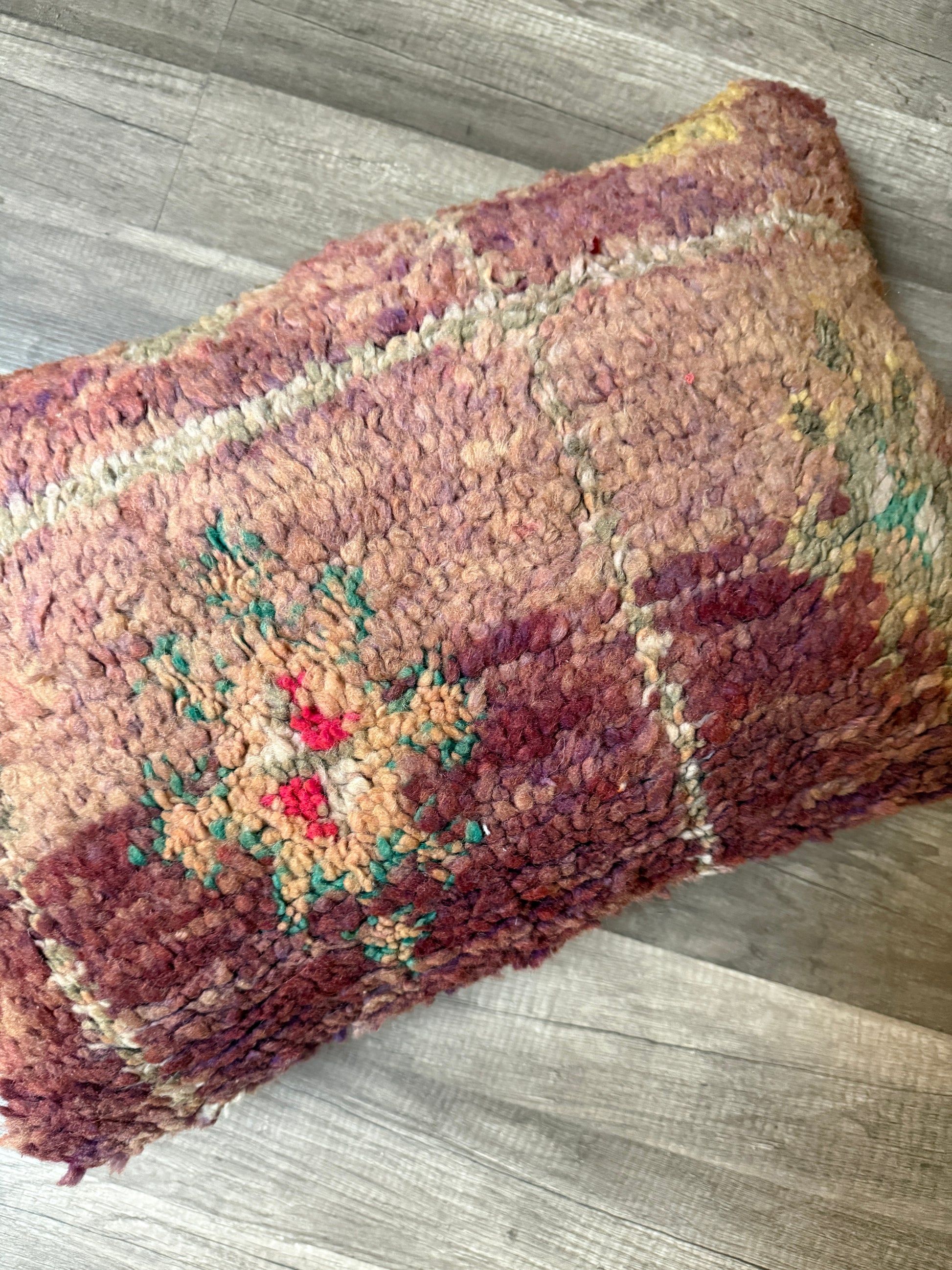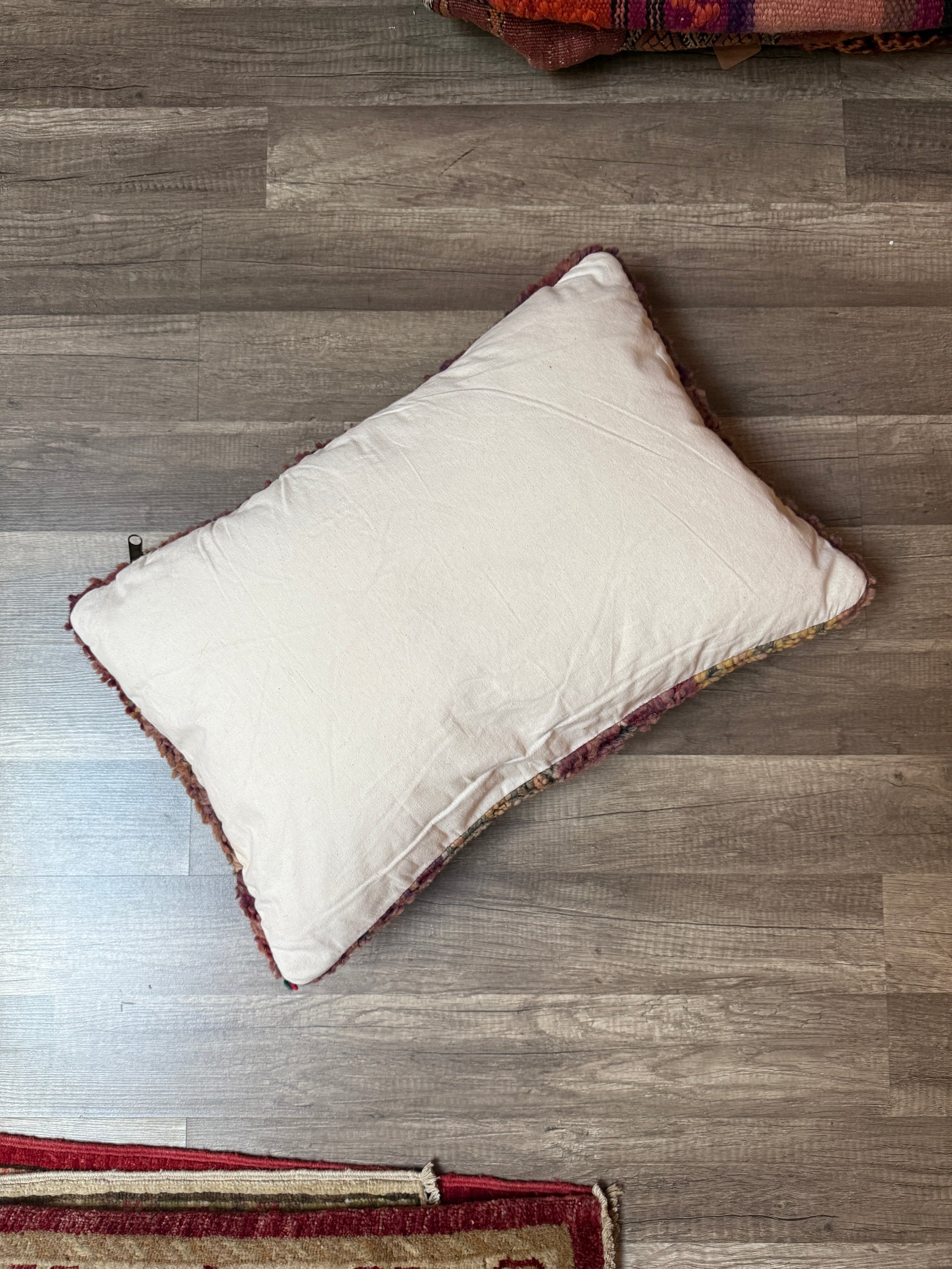 One-of-a-kind pillow cover handmade with vintage Moroccan rugs. Due to natural wear and tear of any vintage rug/textile, color may be faded or spotted and the wool may be worn, which adds to the charm of this one-of-a kind piece.