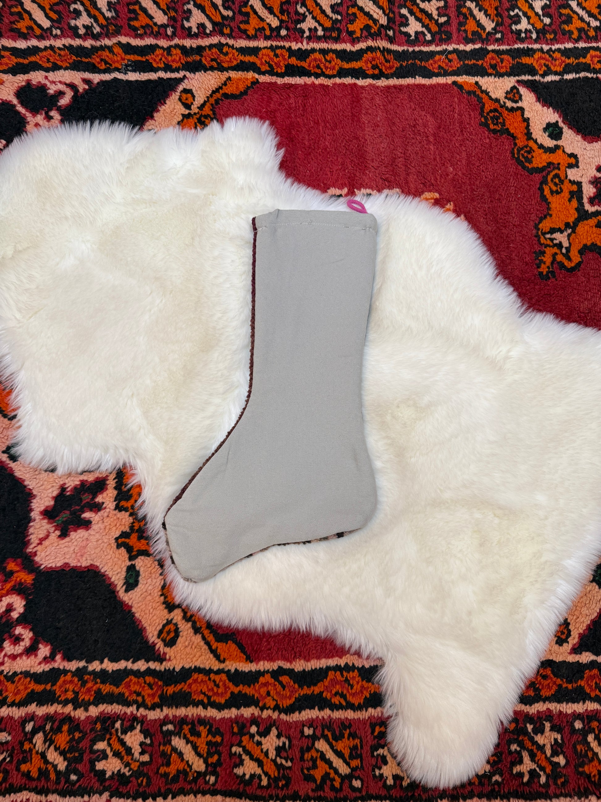 Cover of stocking constructed with 100% organic wool from vintage Turkish rug. Back constructed with cotton.