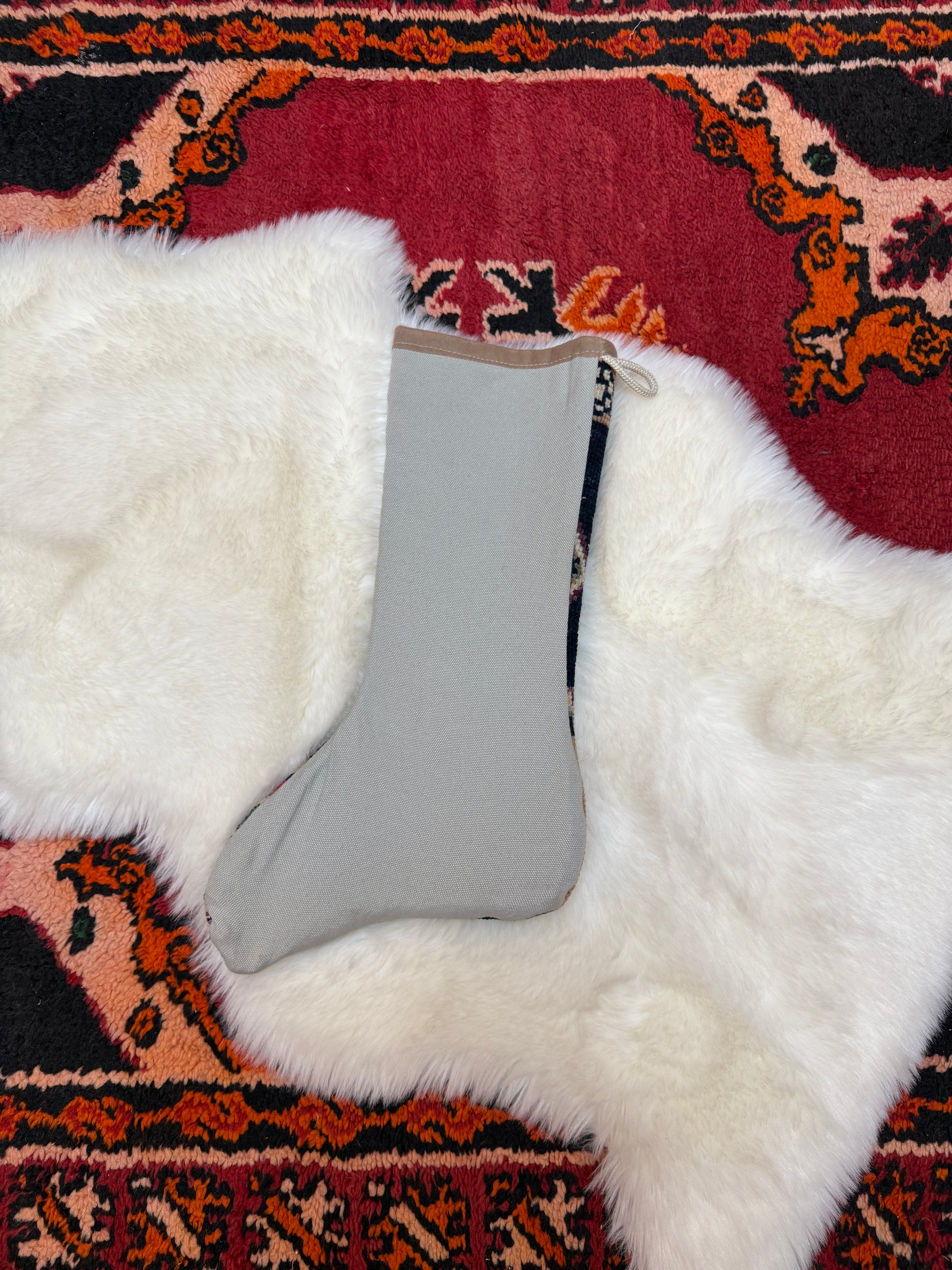 Cover of stocking constructed with 100% organic wool from vintage Turkish rug. Back constructed with cotton.