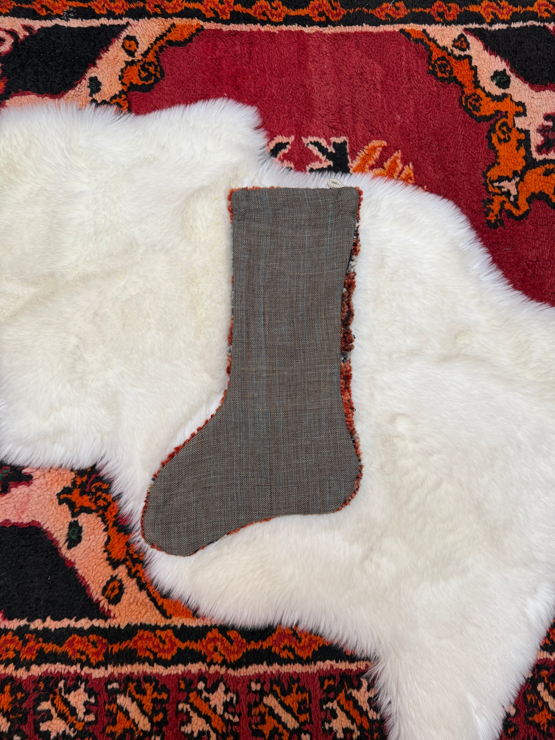Cover of stocking constructed with 100% organic wool from vintage Turkish rug. Back constructed with cotton.