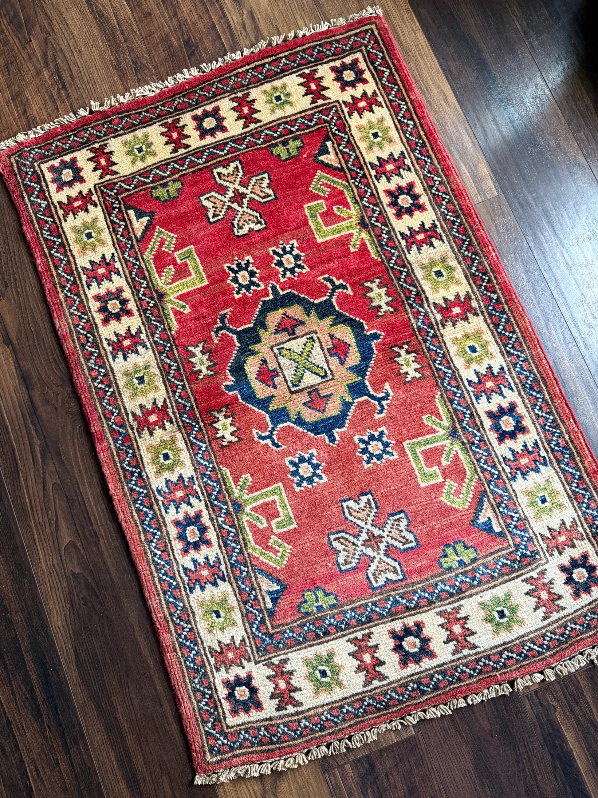 One-of-a-kind vintage handmade Afghan wool rug from approximately the 1990's. Due to natural wear and tear of any vintage rug, color may be faded or spotted and the wool may be worn, which adds to the charm of this one-of-a kind piece.