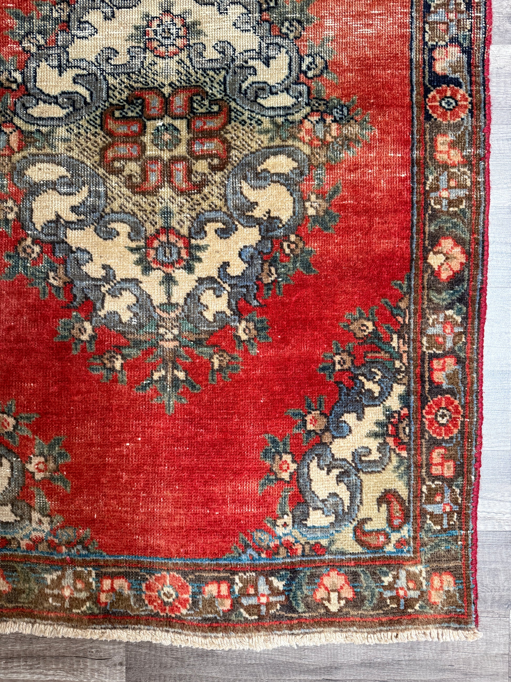 One-of-a-kind vintage Persian style wool rug from approximately the mid century. Due to natural wear and tear of any vintage rug, color may be faded or spotted and the wool may be worn, which adds to the charm of this one-of-a kind piece.