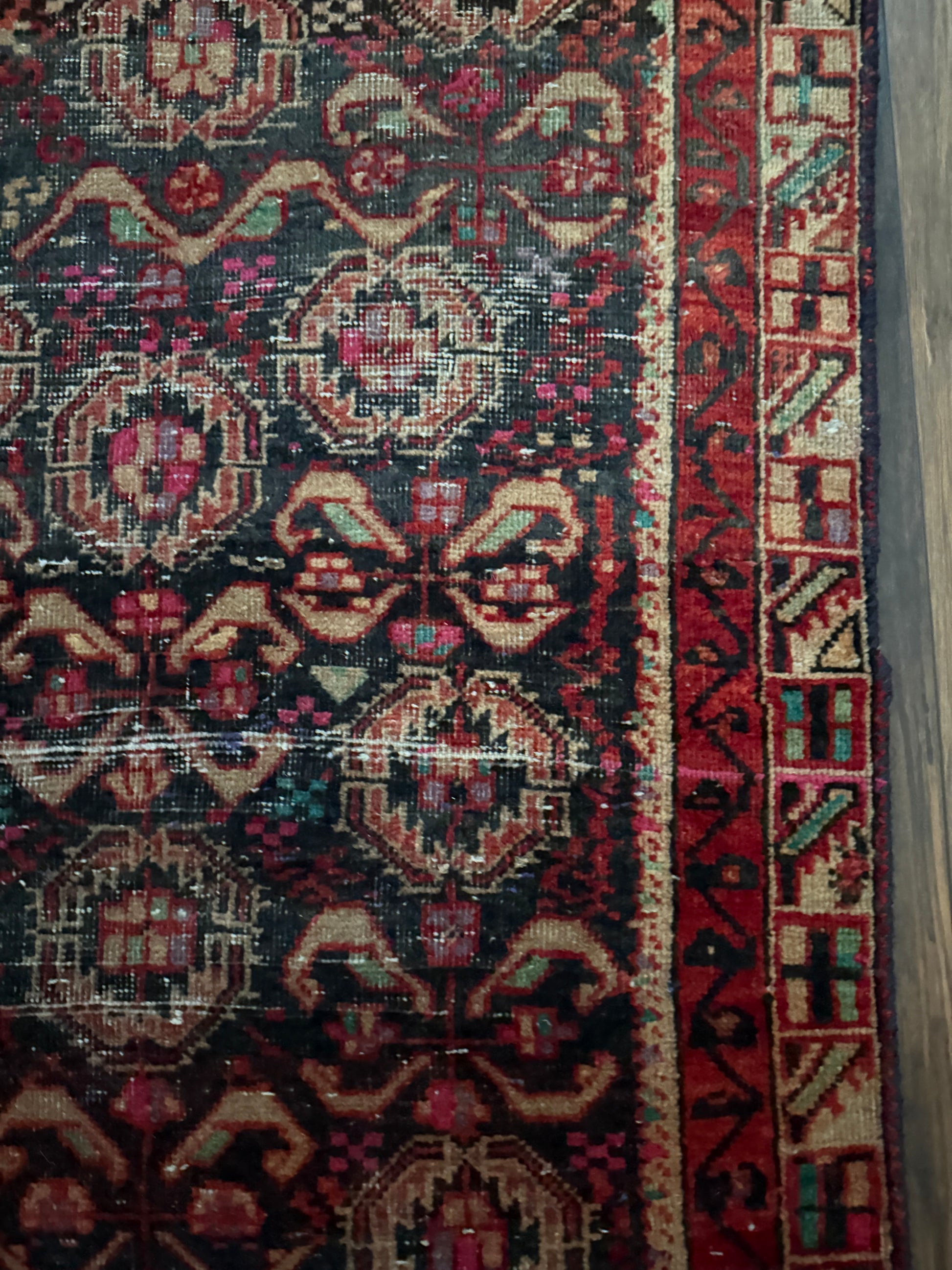 One-of-a-kind vintage Persian style wool rug from approximately the mid century. Due to natural wear and tear of any vintage rug, color may be faded or spotted and the wool may be worn, which adds to the charm of this one-of-a kind piece.