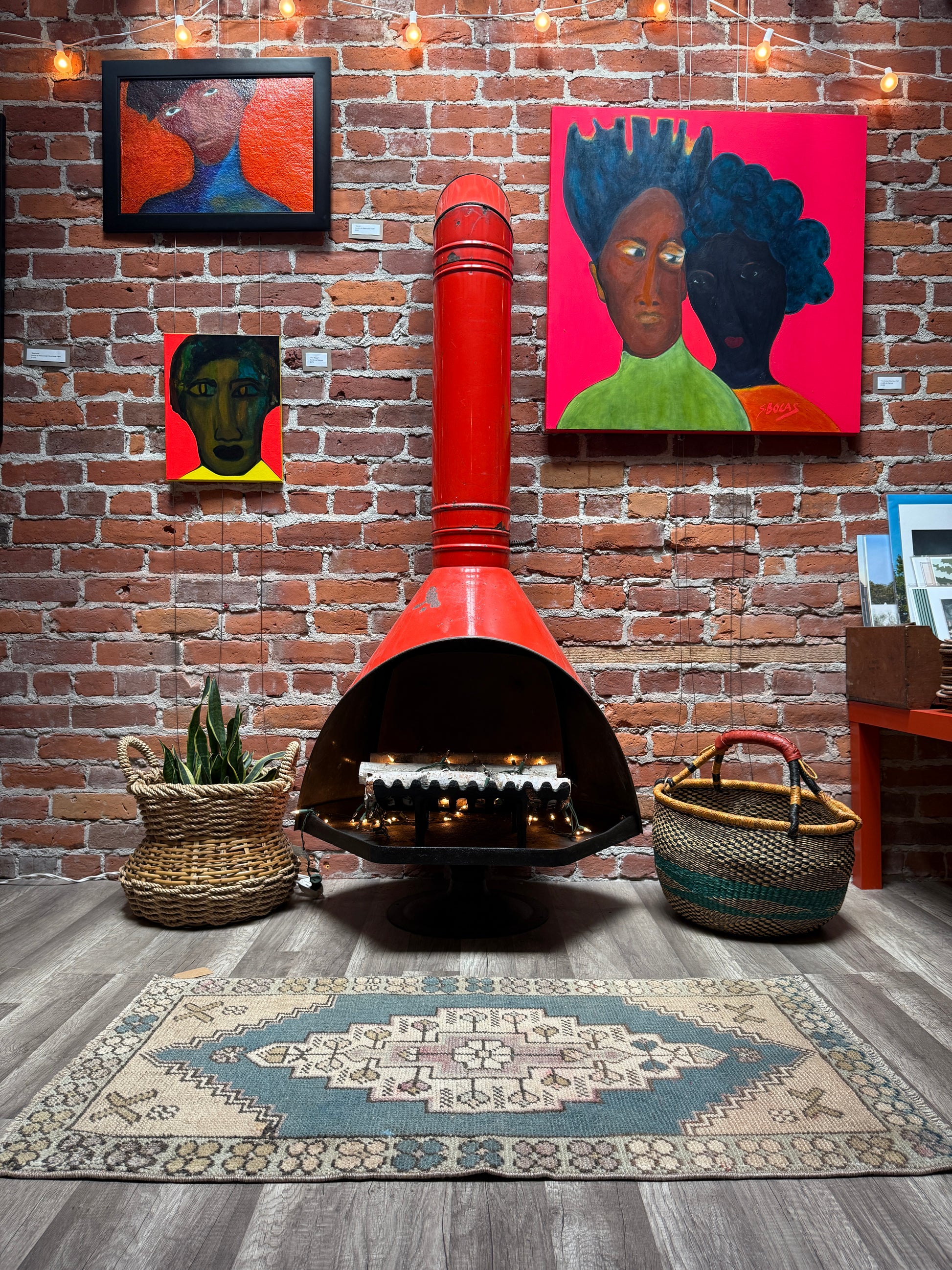 One-of-a-kind vintage handmade Turkish wool rug from approximately the 1960's. Due to natural wear and tear of any vintage rug, color may be faded or spotted and the wool may be worn, which adds to the charm of this one-of-a kind piece.