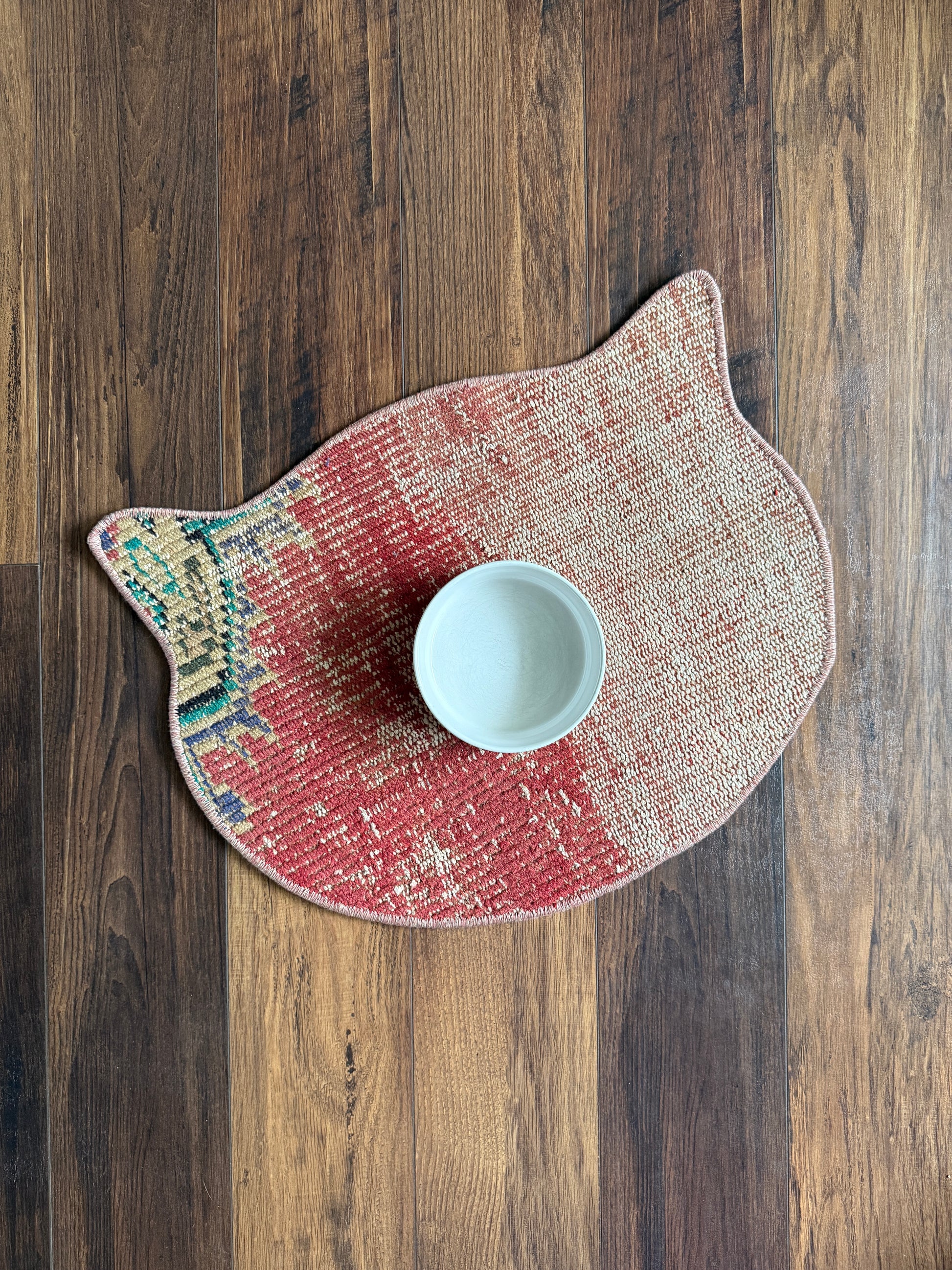 This cat shaped pet food mat is made from one-of-a-kind, handmade vintage Turkish rugs. Each one is totally unique! Due to natural wear and tear of any vintage rug/textile, color may be faded or spotted and the wool may be worn, which adds to the charm of this one-of-a kind piece.