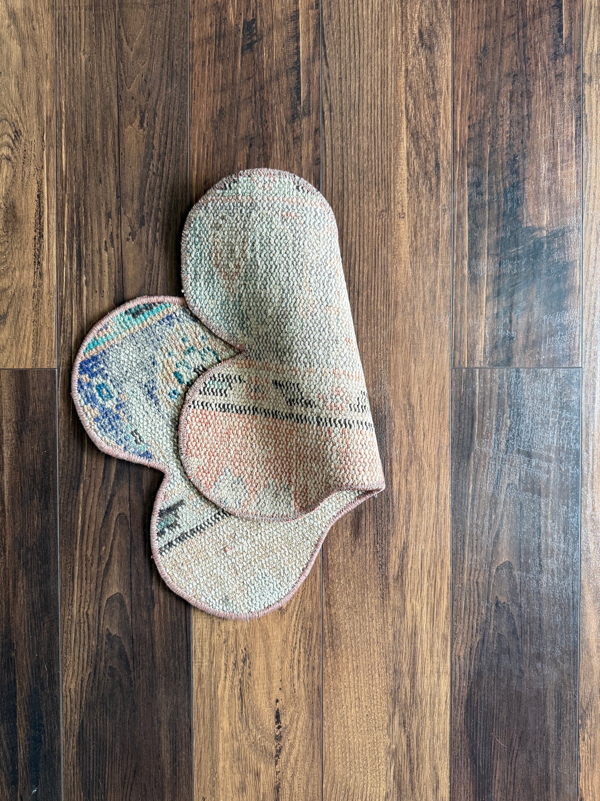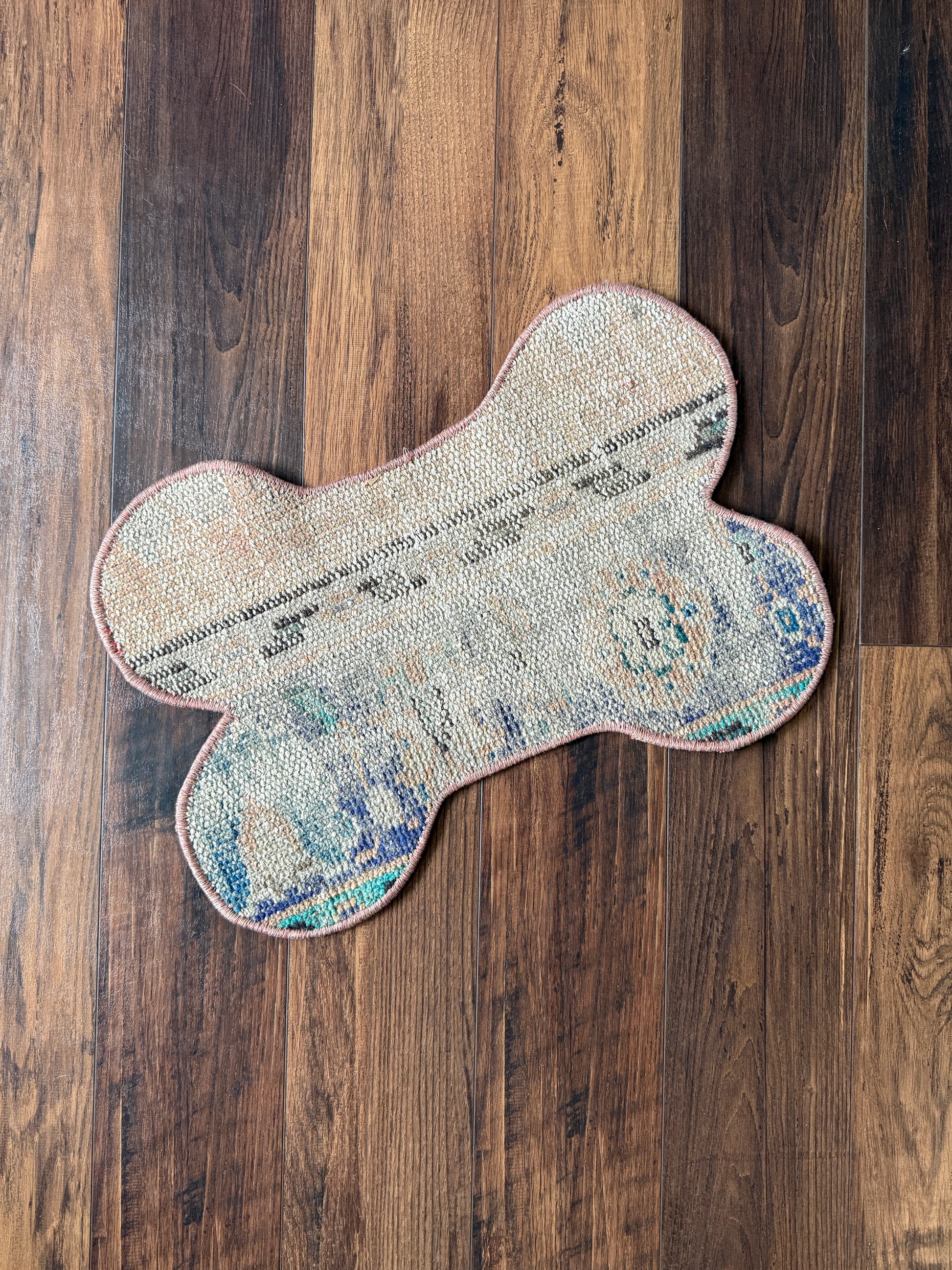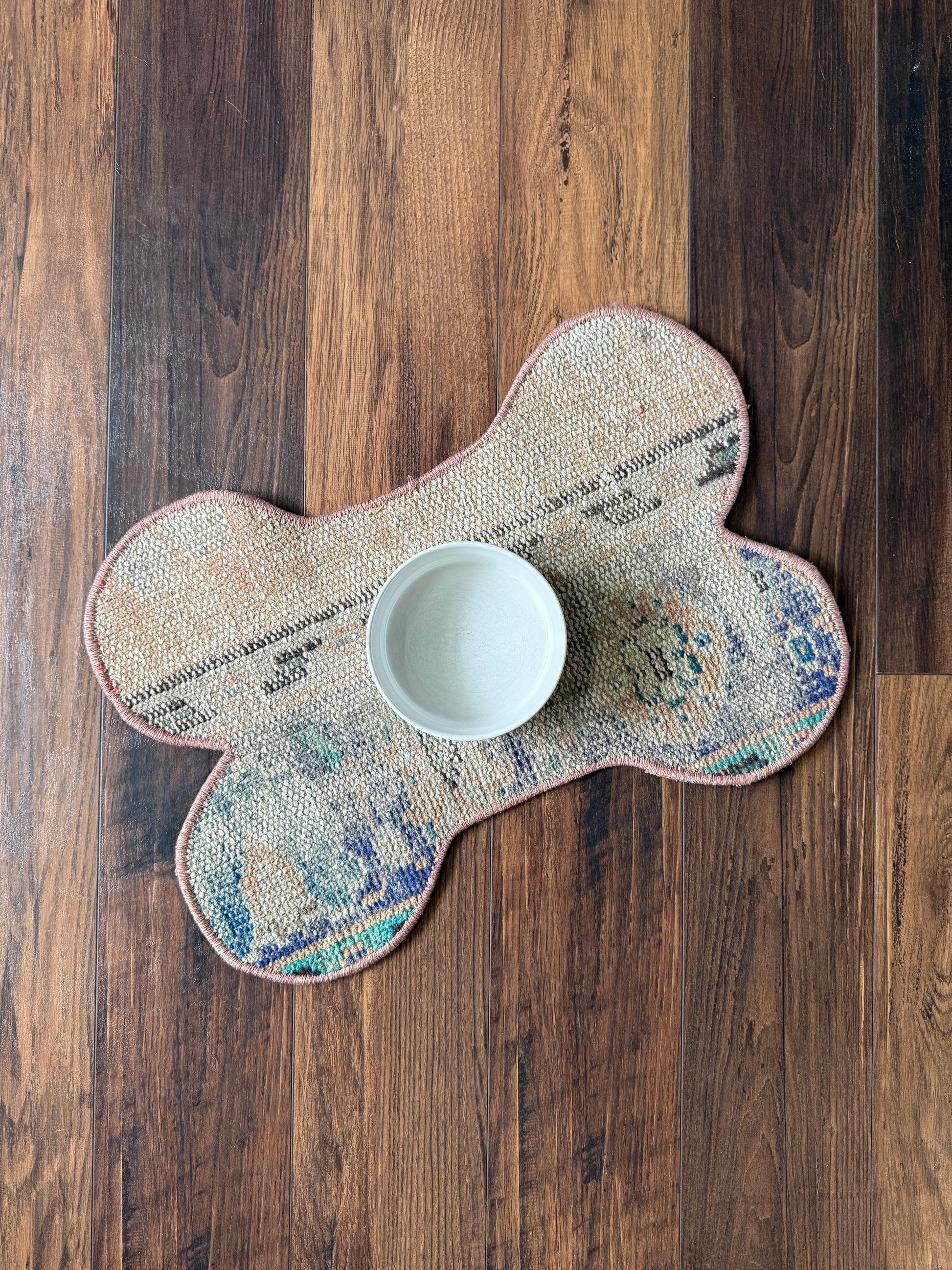 This bone shaped pet food mat is made from one-of-a-kind, handmade vintage Turkish rugs. Each one is totally unique! Due to natural wear and tear of any vintage rug/textile, color may be faded or spotted and the wool may be worn, which adds to the charm of this one-of-a kind piece.